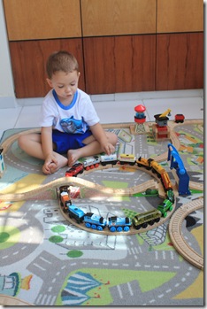 Of course, ever present with Aaron are his Thomas trains. Recently his collection of trains became long enough that he can create a never-ending train to drive around in circles.